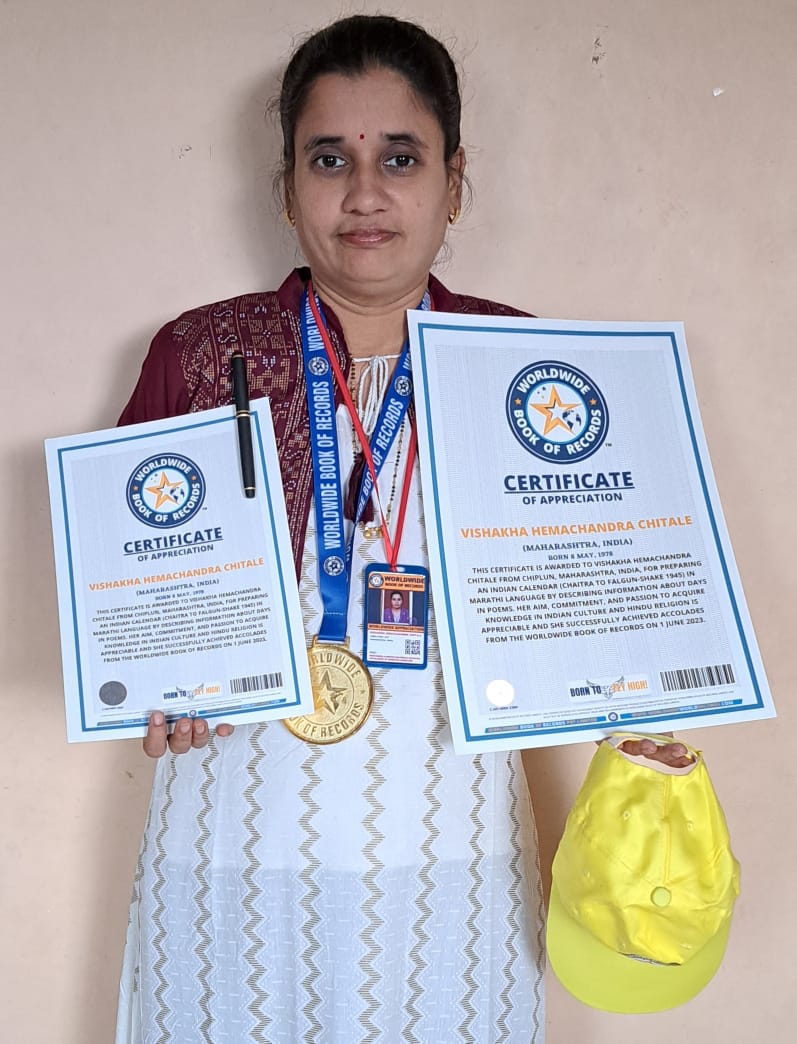 This Certificate Is Awarded To Vishakha Hemachandra Chitale From Chiplun, Maharashtra, India, For Preparing An Indian Calendar (Chaitra To Falgun-Shake 1945) In the Marathi Language By Describing Information About Days In Poems. Her Aim, Commitment, And Passion To Acquire Knowledge In Indian Culture And Hindu Religion Is Appreciable And She Successfully Achieved Accolades From The Worldwide Book Of Records On 1 June 2023.