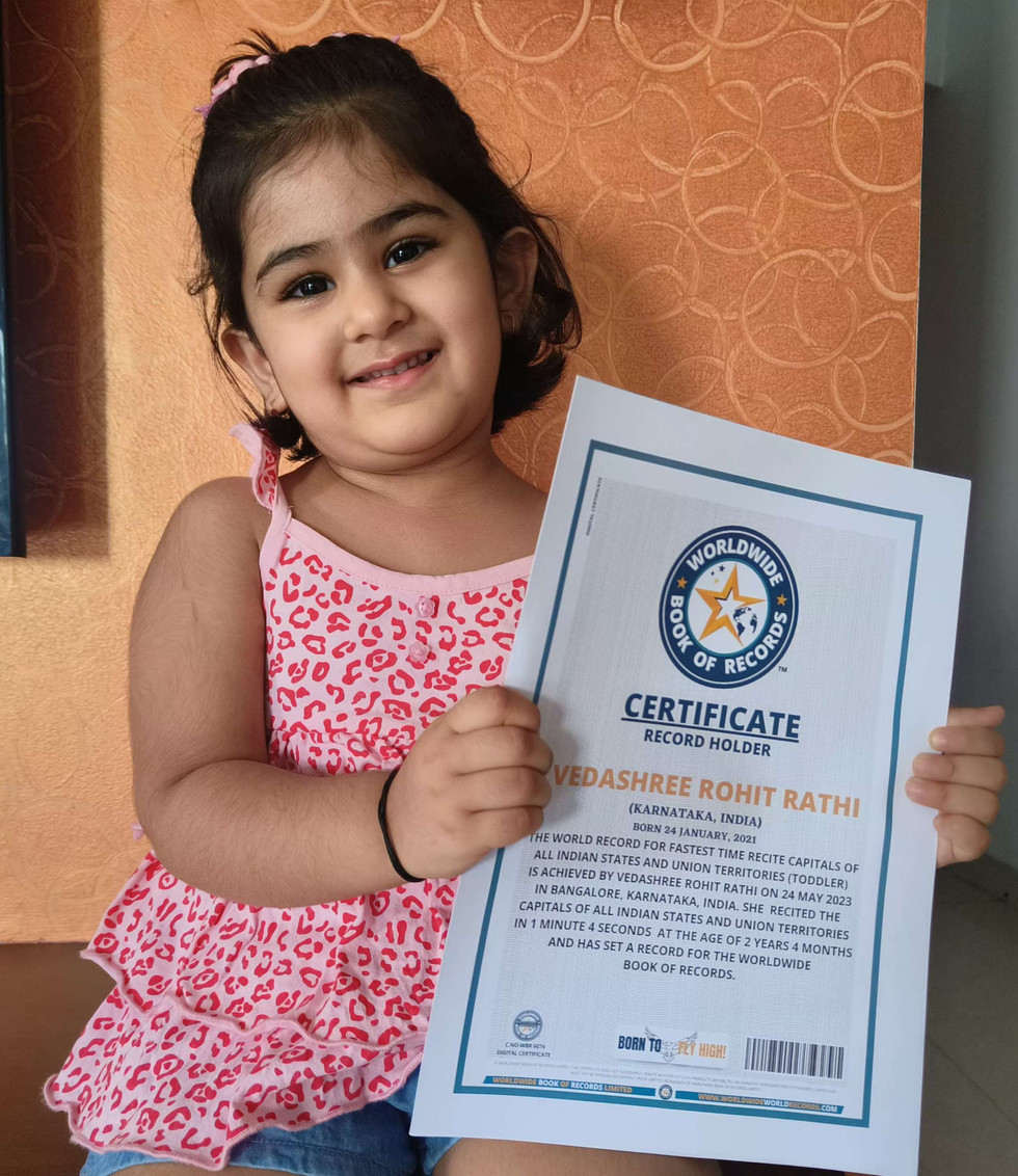 The World Record For Fastest Time Recite Capitals Of All Indian States And Union Territories (Toddler) Is Achieved By Vedashree Rohit Rathi On 24 May 2023