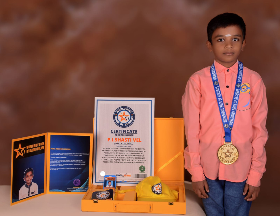 The World Record For Fastest Time To Identify And Recite Flags Of 195 Countries (Youngest kid 7-9 Years age Category) Is Achieved By P.I.Shasti Vel On 21 June 2023 In Coimbatore, Tamil Nadu, India. He Identified And Recited Flags Of 195 Countries In 3 Minutes 21 Seconds At The Age Of 7 Years 7 Days And Has Set A New World Record For The Worldwide Book Of Records.