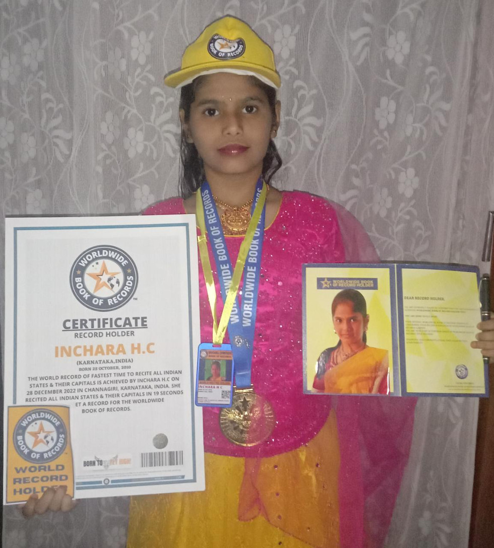 THE WORLD RECORD OF THE FASTEST TIME TO RECITE ALL INDIAN STATES & THEIR CAPITALS IS ACHIEVED BY INCHARA H.C ON 28 DECEMBER 2022 IN CHANNAGIRI, KARNATAKA, INDIA. SHE RECITED ALL INDIAN STATES & THEIR CAPITALS IN 19 SECONDS AND HAS SET A RECORD FOR THE WORLDWIDE BOOK OF RECORDS.