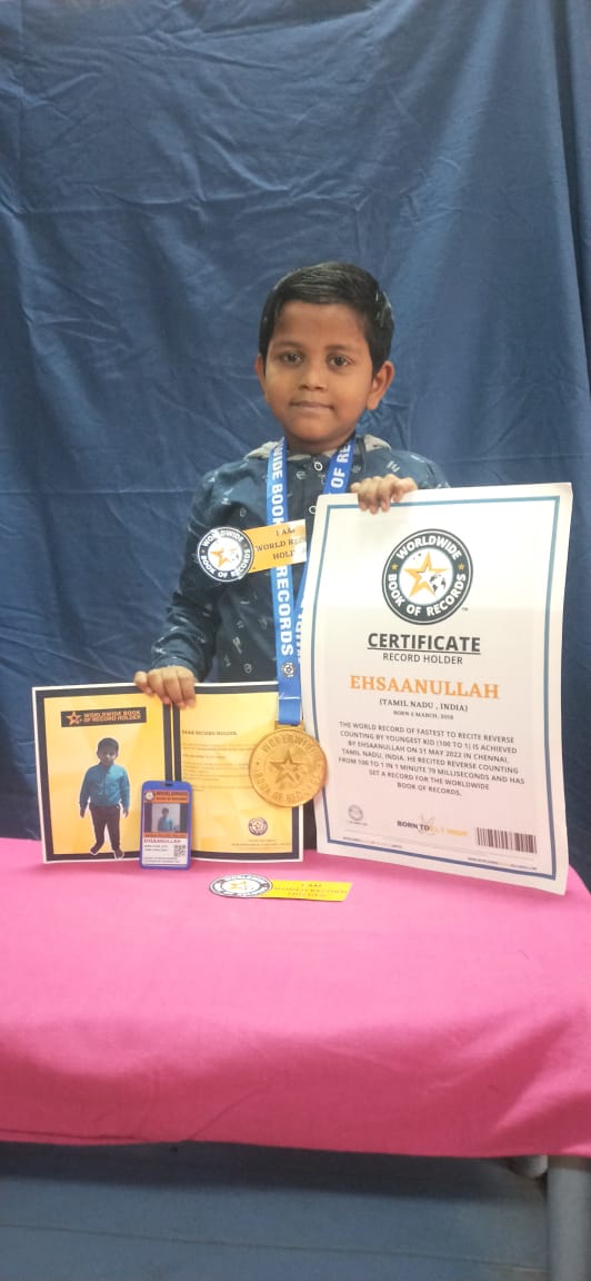 THE WORLD RECORD OF FASTEST TO RECITE REVERSE COUNTING BY YOUNGEST KID (100 to 1) IS ACHIEVED BY EHSAANULLAH ON 31 MAY 2022 IN CHENNAI, TAMIL NADU, INDIA. HE RECITED REVERSE COUNTING FROM 100 to 1 IN 1 MINUTE 79 MILLISECONDS AND HAS SET A RECORD FOR THE WORLDWIDE BOOK OF RECORDS.