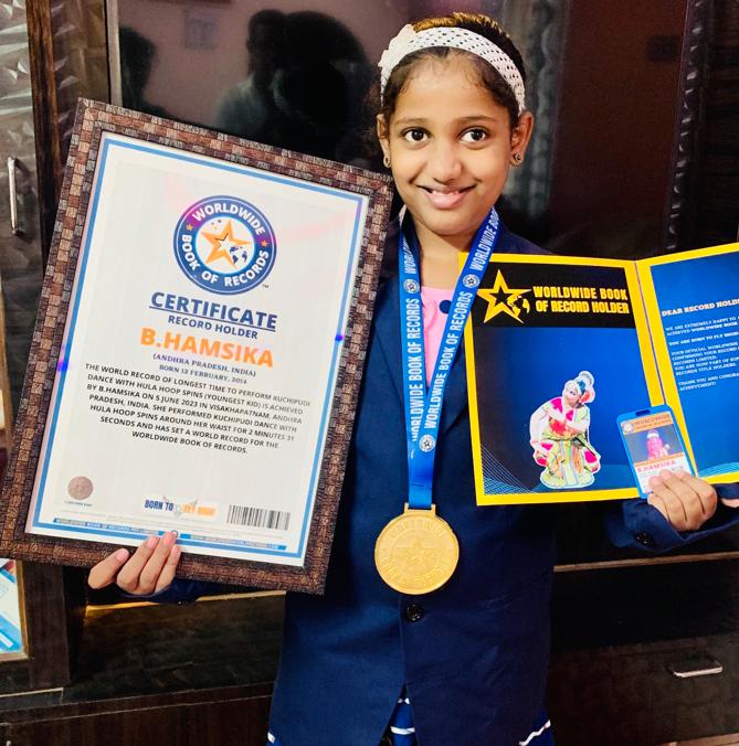 The World Record Of Longest Time To Perform Kuchipudi Dance With Hula Hoop Spins (Youngest Kid) Is Achieved By B.Hamsika On 5 June 2023 In Visakhapatnam, Andhra Pradesh, India. She Performed Kuchipudi Dance With Hula Hoop Spins Around Her Waist For 2 Minutes 31 Seconds And Has Set A World Record For The Worldwide Book Of Records.