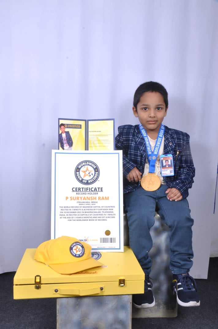 THE WORLD RECORD OF MAXIMUM CAPITAL OF COUNTRIES RECITED IN 1 MINUTE IS ACHIEVED BY P SURYANSH RAM ON 10 DECEMBER 2022 IN BHADRACHALAM, TELANGANA, INDIA. HE RECITED 23 CAPITALS OF COUNTRIES IN 1 MINUTE