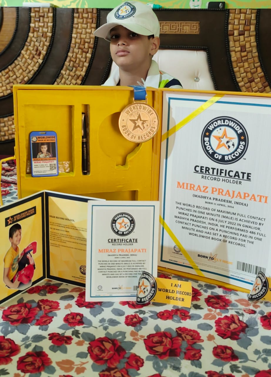 THE WORLD RECORD OF MAXIMUM FULL CONTACT PUNCHES IN ONE MINUTE (MALE) IS ACHIEVED BY MIRAZ PRAJAPATI ON 6 JULY 2022 IN GWALIOR, MADHYA PRADESH, INDIA. HE (Born 11 April 2014) PERFORMED 486 FULL CONTACT PUNCHES ON A PUNCHING PAD IN ONE MINUTE AND HAS SET A RECORD FOR THE WORLDWIDE BOOK OF RECORDS.