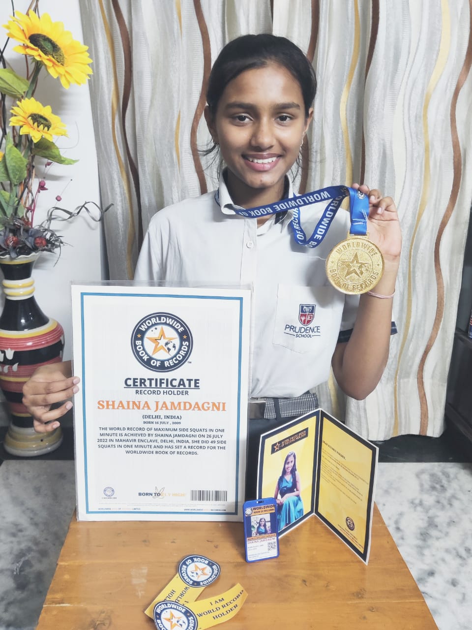 THE WORLD RECORD OF MAXIMUM SIDE SQUATS IN ONE MINUTE IS ACHIEVED BY SHAINA JAMDAGNI ON 26 JULY 2022 IN MAHAVIR ENCLAVE, DELHI, INDIA. SHE (Born 16 July 2009) DID 49 SIDE SQUATS IN ONE MINUTE AND HAS SET A RECORD FOR THE WORLDWIDE BOOK OF RECORDS.