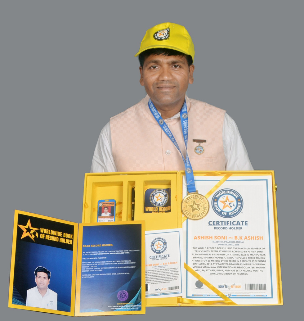 THE WORLD RECORD FOR pulling the maximum number of trucks with teeth at onCE IS ACHIEVED BY ASHISH SONI ALSO KNOWN AS B.K ASHISH ON 17 APRIL 2023 IN MANIPURAM, BHOPAL, MADHYA PRADESH, INDIA. HE PULLED THREE TRUCKS at once for 20 meters BY HIS TEETH IN 1 MINUTE 15 SECONDS ON 1 APRIL 2019 AT PRAJAPITA BRAHMA KUMARIS ISHWARIYA VISHWA Vidyalaya, INTERNATIONAL HEADQUARTER, MOUNT ABU, RAJASTHAN, INDIA, AND HAS SET A RECORD FOR THE WORLDWIDE BOOK OF RECORDS.