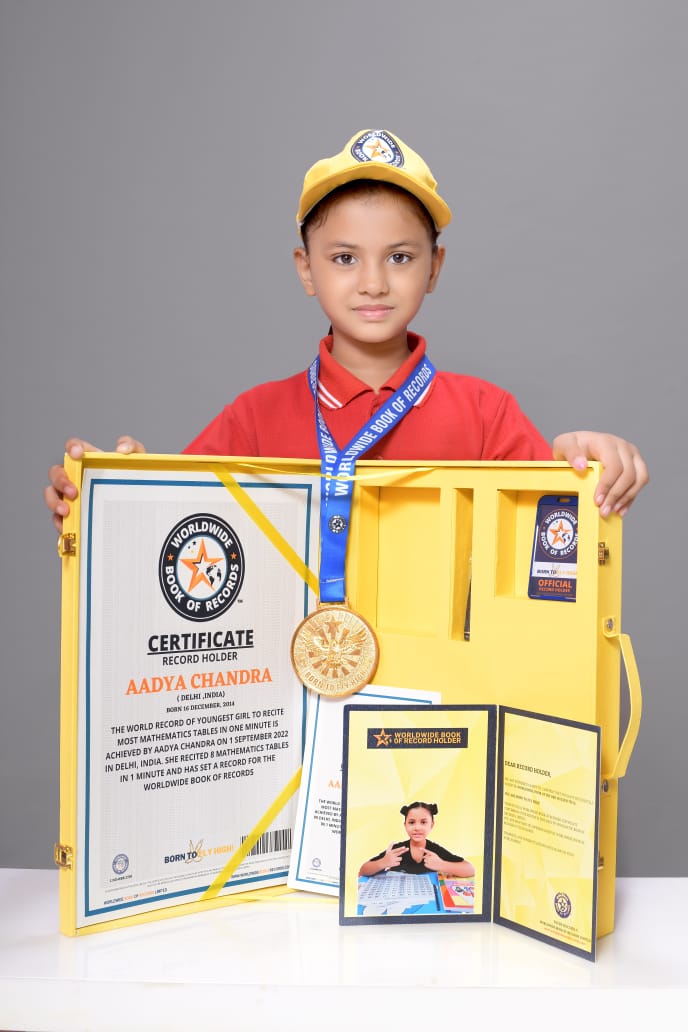 THE WORLD RECORD OF YOUNGEST GIRL TO RECITE MOST MATHEMATICS TABLES IN ONE MINUTE IS ACHIEVED BY AADYA CHANDRA ON 1 SEPTEMBER 2022 IN DELHI, INDIA. SHE (Born 16 December 2014) RECITED 8 MATHEMATICS TABLES IN 1 MINUTE AND HAS SET A RECORD FOR THE WORLDWIDE BOOK OF RECORDS.